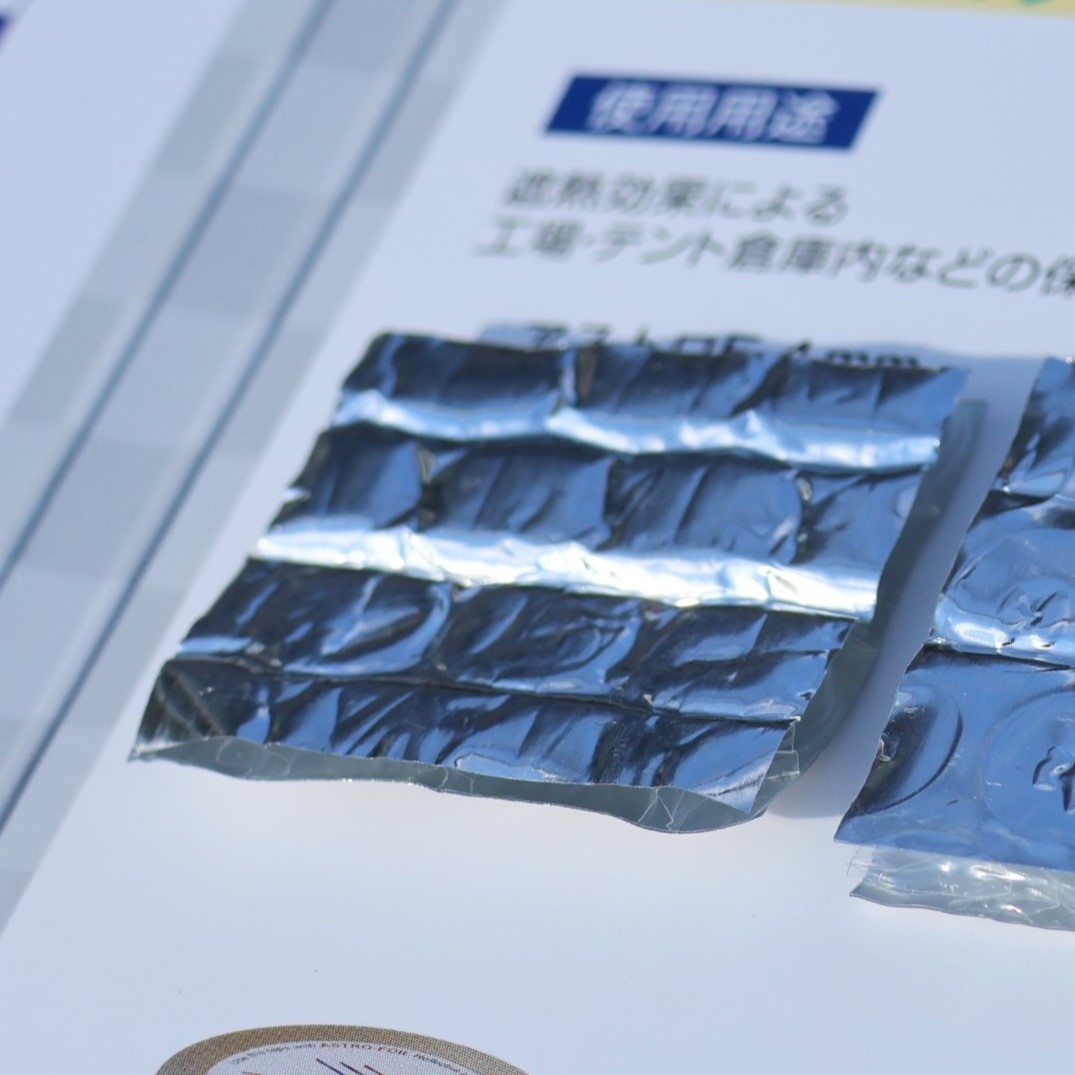 樹脂エアキャップの両面にアルミ箔を貼り合わせた、多層構造の「不燃遮熱材」厚さ4mmタイプ 両面に純度99%のアルミ箔を使用/アストロフォイルが受ける輻射熱を97%反射 日中最大-9.9℃ 冬の消費電力最大20%カット(メーカー調べ)